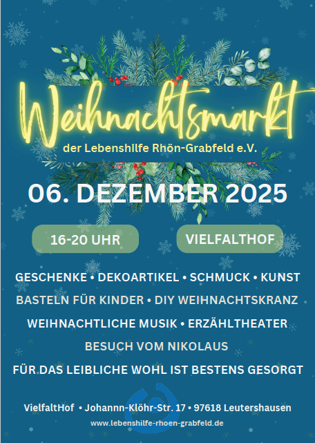 Auch in diesem Jahr laden zahlreiche liebevoll gestaltete Winter-, Advents- und Weihnachtsmärkte in Rhön-Grabfeld zum Verweilen ein. Entdecken Sie festliche Atmosphäre, regionale Köstlichkeiten und viele kleine Besonderheiten, die diese Zeit so einzigartig machen. Genießen Sie gesellige Stunden mit Familie und Freunden und lassen Sie sich von der Vorfreude auf Weihnachten anstecken.