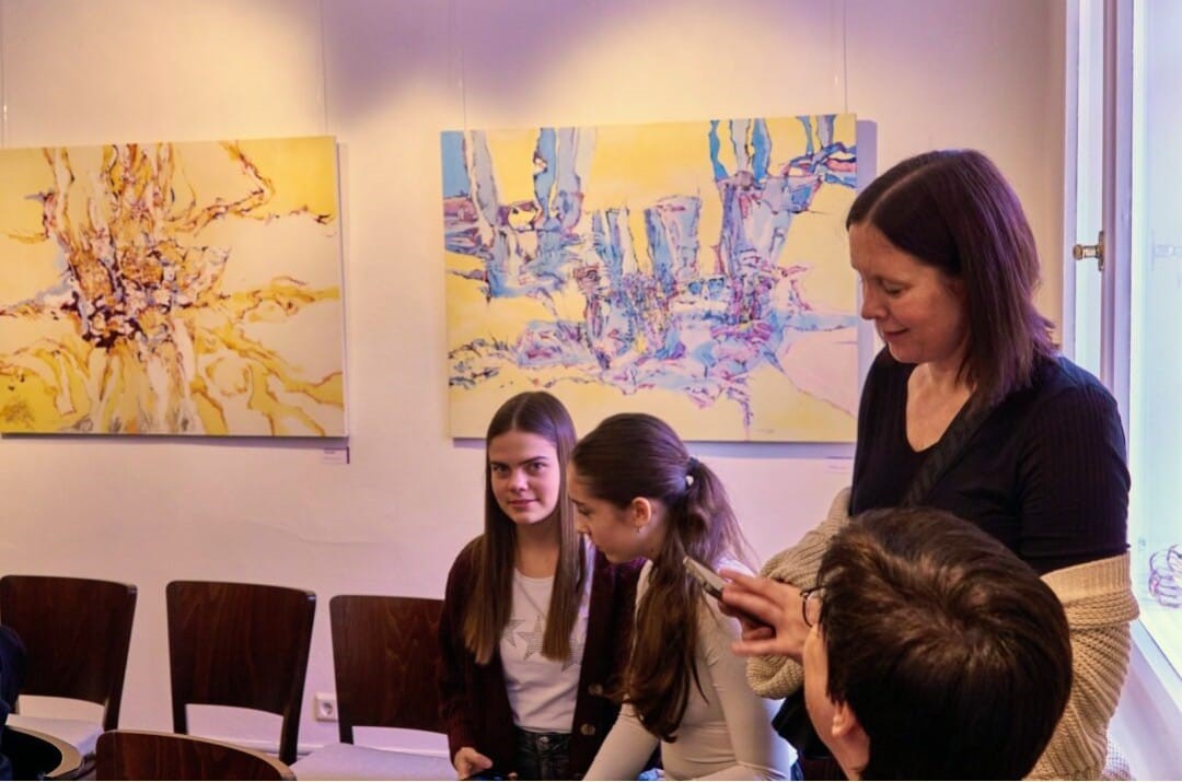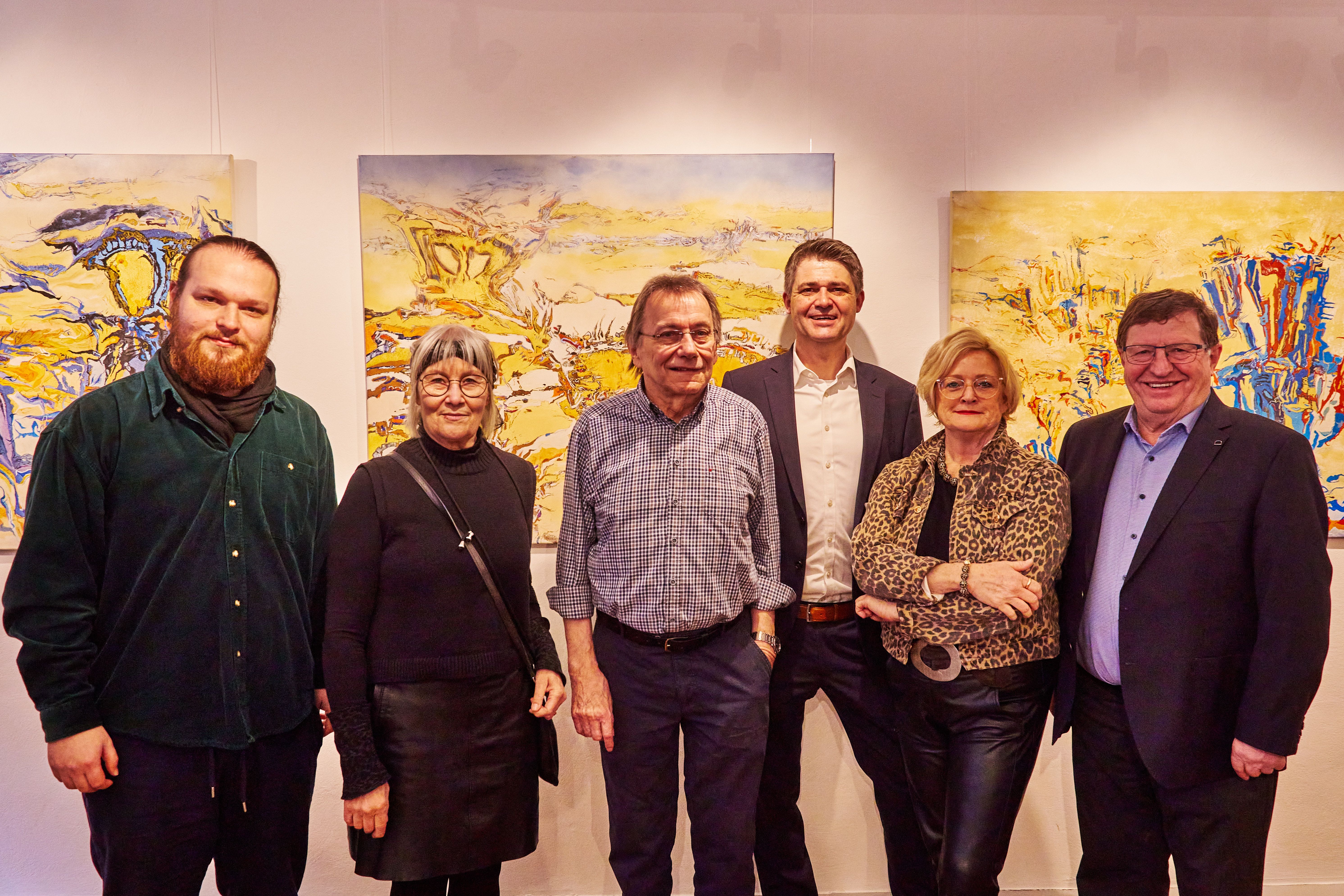 Foto (von links nach rechts): Nik Jira (Musiker), Christine Wehe Bamberger (Laudatio), Günther Lamprecht (Künstler), Bürgermeister Michael Kraus, Astrid Hedrich-Scherpf (Kulturagentur) und stellv. Landrat Josef Demar © Günther Lamprecht